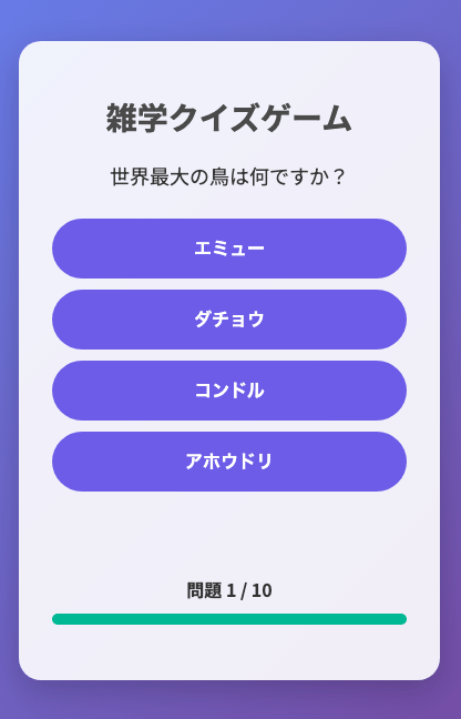 無料で楽しめるクイズゲームのカテゴリです。知識を試す楽しいクイズが満載!幅広いジャンルで、初心者からクイズ好きの上級者まで楽しめます。